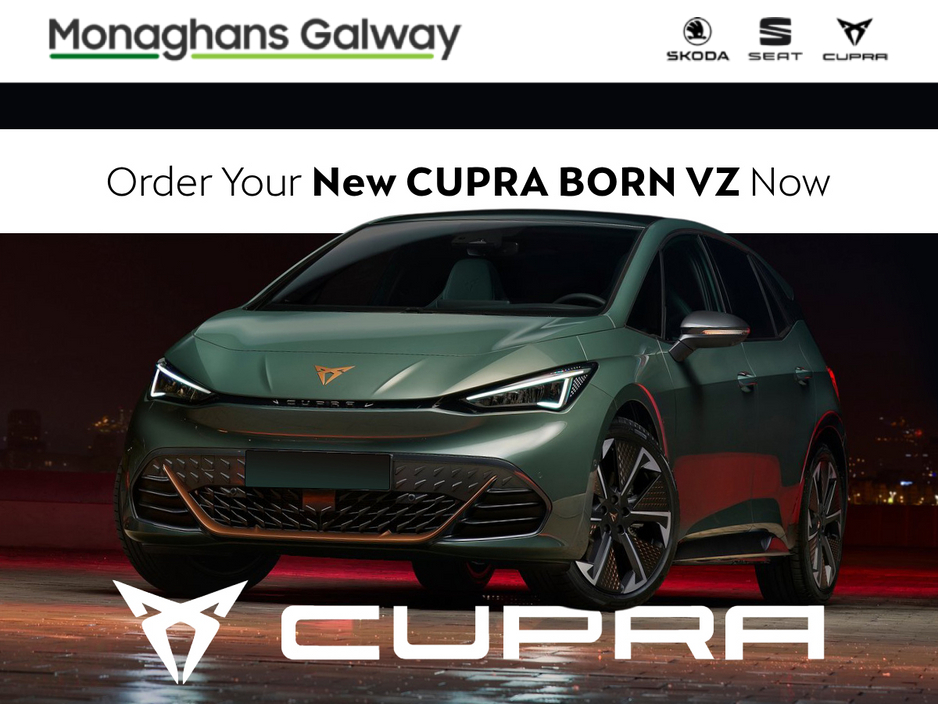 2026 Cupra Born VZ - ORDER NOW STARTING FROM €38,083 EX METALLIC PAINT AND EXTRAS AND INCLUSIVE OF ALL OFFERS Finished in Forest Green Metallic Paint Exclusive to the VZ Model • Heat... -